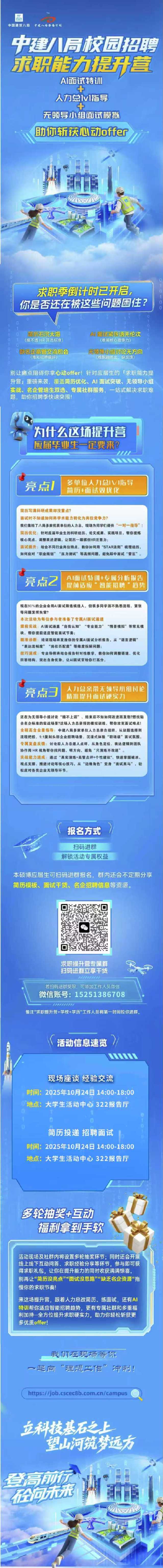 为助力大家高效备战秋招、提升求职竞争力,中建八局举办 “求职能力提升营暨秋季校园招聘” 活动,具体安排如下: